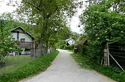 The local church, dedicated to Saint Anne, was built on the top of Hunter's Peak (Slovene: Lovski vrh, German: Annaberg 'Mount Saint Anne'[14]: 193 ) north of the settlement. It is also a site of a prehistoric Iron Age settlement. The pilgrimage church, a 16th-century building that survived the Second World War, was demolished in 1953 or 1954.[16] A chapel-shrine dedicated to Saint Anne was erected next to the site of the former church in 2003.[14]: 193