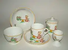 In 1926 Shelley Potteries commissioned Attwell to produce designs for children's china ware, following the successful sales of china decorated with designs by Hilda Cowham. Attwell’s first six designs portrayed scenes involving children, animals and small green elves in green suits – these were called 'Boo Boos' and used on cups, mugs, bowls etc.[5][6]