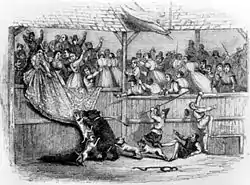In one scene, Macbeth's court hosts bear-baiting, a form of entertainment in the Middle Ages in which a bear and dogs are pitted against each other. Williams suggested the scene communicates Macbeth and Lady Macbeth's growing callousness after taking power,[40] while Kenneth S. Rothwell and Morrison matched the scene to Shakespeare's Macbeth describing himself as "bear-like".[41][42]