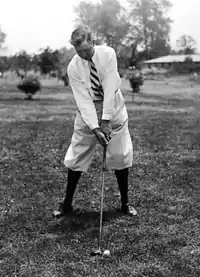![]() Smith set up to hit a fairway wood shot from the rough, c. 1929. | |||