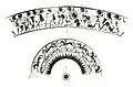 The second band is 1 cm high and depicts a horse race, with six horses galloping from right to left. Beneath one of these horses there is a swan and a crouching figure, possibly an ape.[7] The third band is 4 mm high and is decorated with a hunting scene, in which a hunter and hounds chase a hare and a fox or jackal.[3]