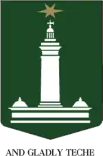 Macquarie's arms was assumed through a 1967 amendment of the Macquarie University Act 1964 (Confirmed by Letters Patent of the College of Arms, 16 August 1969).[33] The escutcheon displays the Macquarie Lighthouse tower, the first major public building in the colony, as well as the Sirius star, the name of the flagship of the First Fleet. The university's founders originally wanted to base the university's arms on Lachlan Macquarie's family crest, but they decided to go for a more radical approach that represented Lachlan Macquarie as a builder and administrator.[34] The motto chosen for the university was And Gladly Teche. This is taken from the general Prologue of The Canterbury Tales, Geoffrey Chaucer c.1400 and symbolises the university's commitment to both learning and teaching.[34] The coat of arms and the motto are used in a very limited number of formal communications.[35]