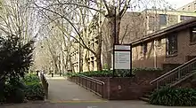 Prior to the development of the campus, most of the site was cultivated with peach orchards, market gardens and poultry farms.[37] The university's first architect-planner was Walter Abraham, one of the first six administrators appointed to Macquarie University.[9] As the site adapted from its former rural use to a busy collegiate environment, he implemented carefully designed planting programs across the campus. Abraham established a grid design comprising lots of 300 square feet (28 m2) running north–south, with the aim of creating a compact academic core. The measure of 300 feet (91 m) was seen as one minute's walk, and grid design reflected the aim of having a maximum walk of 10 minutes between any two parts of the university. The main east–west walkway that runs from the Macquarie University Research Park through to the arts faculty buildings, was named Wally's Walk in recognition of Walter Abraham's contribution to the development of the university.[9]