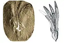 As early a 1903, the fossilized male pollen organs called Codonotheca caduca were speculated to be from plants bearing Macroneuropteris scheuchzeri foliage.[18] In 1907, E.H. Sellards further noted this connection.[19] In the late 1960s, both Laveine (1967)[20] and Darrah (1969) reinforced this association.[21] The pollen found in the fossilized Codonotheca caduca are monolete and exceptionally large (200–550 μm).