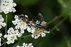 The adults of this sawfly can mostly be encountered from May through July.[3] Adults mainly feed on pollen and nectar, especially on Heracleum sphondylium,[4] but they feed also on honeydew and small insects.[3] The larvae are monophagous and develop on the leaves of blackberries and raspberries (Rubus fruticosus).[3][4]