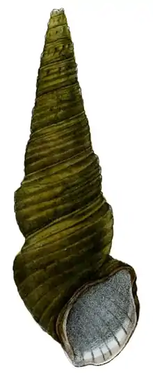The shell is large, elongate-pyramidal, turreted, thick, covered with an olive epidermis.[1] It is closely lineated or strigate with longitudinal lines of a darker tint.[1] The shell has nine whorls.[1][2] Whorls are very slightly convex beneath, strongly spirally ribbed and grooved.[1] The ribs are six in number on the upper whorls and rounded; the two above are much more slender than the four beneath; the uppermost borders the suture; the next lies in the concavity at the top of the whorls; and the rest surround the slight convexity, and are three times as broad as the sulci separating them.[1] All the whorls, with the exception of the last four, are coronated at the slight angle below the excavation with very short, hollow, oblique spinules.[1] Some of the spiral grooves exhibit rows of fine granules.[1] The last whorl descends somewhat, giving the shell a slightly distorted appearance.[1] It is girded with about twelve transverse costae, a few at the base being smaller than five principal ones around the middle.[1]