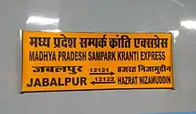 The 12121 / 12122 Madhya Pradesh Sampark Kranti Express, is one of the trains among Sampark Kranti Express trains introduced in the 2005 Indian Railway Budget. The train was announced between Jabalpur (in Madhya Pradesh) and New Delhi. This train presently terminates at Hazrat Nizamuddin railway station in Delhi which is located 8 kilometres (5.0 mi) approximately to south of New Delhi railway station.