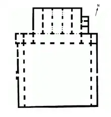 The main structure consisted of three parallel rectangular halls oriented east-west.[75] The halls were entered from the south: the southern walls of the first two halls each had three openings or doorways of equal size aligned in a row. The third hall, at the back, was much smaller and had only one door, which was aligned with the middle doors of the other two halls. Each hall was also flanked on both sides by small square (or nearly square) chambers. The first main hall may have served as an entrance hall, the second one may have been a reception room, and the third hall may have been a private sitting area whose side rooms served as bedrooms. The second and third halls have been partly reconstructed today, but the first (southernmost) hall has been lost. It stood at the very edge of the terrace, 15 meters above the ground of the next level below. In front of the eastern corner of this hall, however, are the remains of a staircase that led down to the terrace below.[75] On the east side of the main structure is another apartment consisting of a courtyard, a portico of arches, and a hall, which was built over a former bathhouse[74]