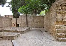 The city's main congregational mosque, also known today as the Aljama Mosque, was located on the lower level just east of the Upper Garden and Salón Rico complex. It could be reached from the palaces via a covered ramp passage in the eastern wall of the Upper Garden's terrace.[55] Other roads led to the mosque from the rest of the city around it. Like the Great Mosque of Cordoba, a private passage allowed for the caliph to enter the mosque directly into the maqsura, the privileged area near the mihrab.[12] The mosque had a rectangular floor plan aligned northwest to southeast, in accordance with the qibla (direction of prayer). This orientation is notably different from the southern qibla orientation of the much older Great Mosque of Cordoba, which reflects that conceptions of the qibla changed over time in this part of the Islamic world.[56][57] Outside the mosque, on its northwest side and near the entrance, is a set of facilities which provided for the ritual of ablutions.[58]