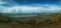 Madurai is one of the many temple towns in the state which is named after the groves, clusters or forests dominated by a particular variety of a tree or shrub and the same variety of tree or shrub sheltering the presiding deity. The region is believed to have been covered with Kadamba forest and hence called Kadambavanam.[17] The city is referred by various names including "Madurai", "Koodal", "Malligai Maanagar", "Naanmadakoodal" and "Thirualavai". The word Madurai may be derived from Madhura (sweetness) arising out of the divine nectar showered on the city by the Hindu god Siva from his matted hair.[18] Another theory is that Madurai is the derivative of the word Marutham, which refers to the type of landscape of the Sangam age. A town in the neighbouring Dindigul district is called Vada Madurai (North Madurai) and another in Sivagangai district is called Manamadurai. The different names by which the city has been referred to historically are listed in the 7th-century poem Thiruvilayaadal Puraanam written by Paranjothi Munivar.[18][19] Vaishnava texts refer to Madurai as the "southern Mathura", probably similar to Tenkasi (southern Kashi).[20][21]