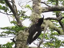 The species commonly co-occurs with the Chilean flicker (Colaptes pitius) and the striped woodpecker (Veniliornis lignarius), but does not directly compete with them due to differing body sizes and habitat and prey preferences.[9] These woodpeckers commonly feed in pairs or small family groups and are very active in their food searching; they spend most of the daytime looking for prey. They generally use live trees, but also feed on dead substrates such as fallen or broken trees lying on the ground, although generally spend little time doing so. Once the snow disappears from the ground in spring, Magellanic woodpeckers look for prey on humid lower tree trunks. In Tierra del Fuego, Magellanic woodpeckers forage on decaying and dead trees around ponds hosting the introduced American beaver (Castor canadensis).[10]