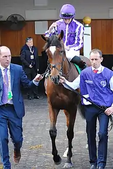 At Ascot on 17 October the mare ran for the second time in the Champion Stakes and started the 15/8 favourite in a ten-runner field. She was restrained by Moore in the early stages before staying on strongly in the straight but never looked likely to win and finished third behind Addeybb and the French challenger Skalleti.[33] On 7 November at Keeneland Magical started favourite in her second attempt to win the Breeders' Cup Turf. She tracked the leaders and stayed on well in the closing stages and was beaten a length by Tarnawa after overhauling the front-running Channel Maker for second place in the final strides.[34] On her final run of the year, Magical started favourite for the Hong Kong Cup at Sha Tin Racecourse in December and finished third in a closely contested finish, beaten three quarters of a length and a short head by the Japanese runners Normcore and Win Bright.[35]