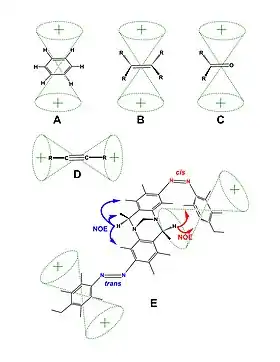 The magnetic anisotropy of a benzene ring (A), alkene (B), carbonyl (C), alkyne (D), and a more complex molecule (E) are shown in the figure. Each of these unsaturated functional groups (A-D) create a tiny magnetic field and hence some local anisotropic regions (shown as cones) in which the shielding effects and the chemical shifts are unusual. The bisazo compound (E) shows that the designated proton {H} can appear at different chemical shifts depending on the photoisomerization state of the azo groups.[4] The trans isomer holds proton {H} far from the cone of the benzene ring thus the magnetic anisotropy is not present. While the cis form holds proton {H} in the vicinity of the cone, shields it and decreases its chemical shift.[4] This phenomenon enables a new set of nuclear Overhauser effect (NOE) interactions (shown in red) that come to existence in addition to the previously existing ones (shown in blue).