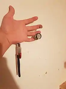 Magnetic implantation is an experimental procedure in which small, powerful magnets (neodymium) are inserted beneath the skin, often in the tips of fingers. They exist in tubes and discs. This procedure is popular among biohackers and grinders, but remains experimental.[1] Magnetic implants are often performed by amateurs at home, using readily available surgical tools and magnets found online. However, some professional body modification shops do perform implant surgeries.[2] Magnetic implants can also be used as an interface for portable devices to create other new "senses", for example converting other sensory inputs such as ultrasonic or infra-red into a touch sensation. In this way the individual could 'feel' e.g. the distance to objects.[3]