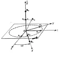 Though the notion of spin angular momentum arises only in quantum mechanics and has no classical analogue, magnetic resonance phenomena can be explained via classical physics to some extent. When viewed from the reference frame attached to the rotating field, it seems that the magnetic dipole precesses around a net magnetic field , where is the unit vector along uniform magnetic field and is the same in the direction of rotating field and .