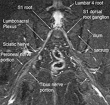 Use of magnetic resonance neurography is increasing in neurology and neurosurgery as the implications of its value in diagnosing various causes of sciatica becomes more widespread.[25][26] There are 1.5 million lumbar MRI scans performed in the US each year for sciatica, leading to surgery for a herniated disk in about 300,000 patients per year. Of these, about 100,000 surgeries fail. Therefore, there is successful treatment for sciatica in just 200,000 and failure of diagnosis or treatment in up to 1.3 million annually in the US alone. The success rate of the paradigm of lumbar MRI and disk resection for treatment of sciatica is therefore about 15%(Filler 2005). Neurography has been applied increasingly to evaluate the distal nerve roots, lumbo-sacral plexus and proximal sciatic nerve in the pelvis and thigh to find other causes of sciatica. It is increasingly important for brachial plexus imaging and for the diagnosis of thoracic outlet syndrome.[27] Research and development in the clinical use of diagnostic neurography has taken place at Johns Hopkins, the Mayo Clinic, UCLA, UCSF, Harvard, the University of Washington in Seattle, University of London, and Oxford University (see references below) as well as through the Neurography Institute. Recent patent litigation concerning MR Neurography has led some unlicensed centers to discontinue offering the technique. Courses have been offered for radiologists at the annual meetings of the Radiological Society of North America (RSNA), and at the International Society for Magnetic Resonance in Medicine and for surgeons at the annual meetings of the American Association of Neurological Surgeons and the Congress of Neurological Surgeons. The use of imaging for diagnosis of nerve disorders represents a change from the way most physicians were trained to practice over the past several decades, as older routine tests fail to identify the diagnosis for nerve related disorders. The New England Journal of Medicine in July 2009 published a report on whole body neurography using a diffusion based neurography technique.[28] In 2010, RadioGraphics - a publication of the Radiological Society of North America that serves to provide continuing medical education to radiologists - published an article series taking the position that Neurography has an important role in the evaluation of entrapment neuropathies.[29]