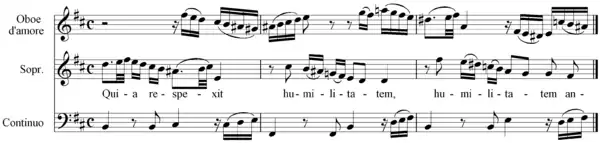 For the 1733 version, Bach used a somewhat more extended orchestra: the recorders are replaced by traversos (Fl) and they get separate parts in all four choral movements.[65] In movements three and four the oboes are replaced by oboes d'amore (Oa). In the 10th movement (Suscepit Israel) the oboes replace the trumpet for the obbligato instrumental part.[66][64]