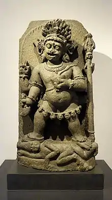 Mahākāla is a deity common to Hinduism and Tantric Buddhism.[1] In Buddhism, Mahākāla is a fierce form of Vishnu,[lower-alpha 1][lower-alpha 2] While in Hinduism, Mahākāla is a fierce manifestation of Shiva.[1] and is the consort of the goddess Mahākālī; he most prominently appears in the Kalikula sect of Shaktism.[2][3][4] Mahākāla also appears as a protector deity known as a dharmapala in Vajrayana, Chinese Esoteric, and Tibetan Buddhism[1] (see Citipati), and also in the Chàn and Shingon traditions. He is known as Dàhēitiān and Daaih'hāktīn (大黑天) in Mandarin and Cantonese, Daeheukcheon (대흑천) in Korean, Đại Hắc Thiên in Vietnamese, and Daikokuten (大黒天) in Japanese.