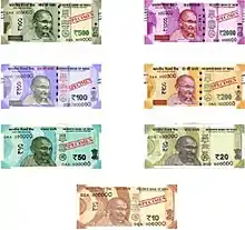 The Mahatma Gandhi New Series of banknotes are issued by the Reserve Bank of India (RBI) as the legal tender of the Indian rupee (₹), intended to replace the Mahatma Gandhi Series of banknotes. Announced on 8 November 2016, it followed the demonetisation of ₹500 and ₹1000 banknotes of the original Mahatma Gandhi Series. Similar to the preceding series of banknotes, the obverse of the Mahatma Gandhi New Series banknotes also prominently displays the portrait of Mahatma Gandhi. The logo of Swachh Bharat Abhiyan is also printed on the back of the banknotes of this series.