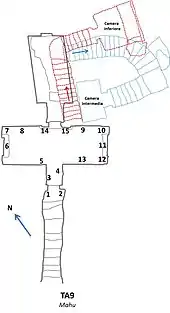 In the back is a doorway to a second chamber that is positioned slightly askew compared to the first chamber. A winding set of stairs at the back of this second chamber leads down to an intermediary room. Further steps complete the turn and lead to the lower chamber which contains the burial pit.[1]
