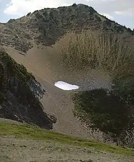 Maiden Peak is a 6,434-foot-elevation (1,961 meter) summit located in Olympic National Park, in Clallam County of Washington state.[3] It is part of the Olympic Mountains and is situated near the eastern end of Hurricane Ridge within the Daniel J. Evans Wilderness. The nearest higher neighbor is Elk Mountain, 1.62 mi (2.61 km) to the west-southwest, and Blue Mountain is set 3.14 mi (5.05 km) to the east-northeast.[1] The peak is set approximately midway along the trail which connects Deer Park and Obstruction Point. Precipitation runoff from the south slope of the mountain drains into Grand Creek, whereas the north slope is drained by Maiden Creek, and all ultimately reaches the Strait of Juan de Fuca. Topographic relief is significant as the summit rises 3,000 feet (914 meters) above Grand Creek in one mile. This landform's name was officially adopted in 1961 by the U.S. Board on Geographic Names.[3] One story has the origin of the name being derived from nearby Maiden Lake where young men and women camped around 1913, and the other being from a group of hikers that passed this area.[4]