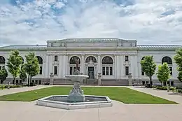 The original building was designed by Albert Randolph Ross of New York. It was built in a Beaux-Arts style (sometimes referred to as Second Renaissance Revival-style[9]), using white Vermont marble on a gray granite base.[2] It has two stories and a basement.[8] The west facade is lively with arches, columns, friezes, and carved cherubs. A large frieze reads "Biblioteca Fons Eruditionis", or "the library, the fount of learning".[2] A smaller frieze over the central entranceway reads "Open to all" in bold capital letters (Carnegie required that anyone use the libraries he funded).[20] The facade also features a row of benches, with the inscription "my treasures are within" across them; this phrase was suggested to be used by Carnegie, in his letter awarding his funds. Friezes atop windows on the west facade mention the classical poets Virgil and Homer; other inscriptions credit Carnegie for funding the library and another has the Latin word "anno" followed by Roman numerals "MCMIV", meaning "the year 1904", when the cornerstone was laid.[23]