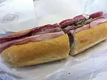 The traditional Maine Italian sandwich is prepared using a long bread roll or bun with meats such as salami, mortadella, capicolla and ham along with provolone, tomato, onion, green bell pepper, Greek olives, olive oil or salad oil, salt and cracked black pepper.[3][4][5] Additional ingredients, such as pepperoni and/or banana pepper may be added to the Maine Italian sandwich. The sandwich is often cut in half to make it easier to handle.[3][6][7] The flavors and texture of the sandwich are unified by the ingredients used to create a gastronomic equilibrium, with the fats and acids in the ingredients serving to counterbalance one another.[5][7]