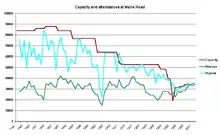 The first match at Maine Road took place on 25 August 1923 when 58,159 fans watched the home side beat Sheffield United 2–1.[14] The first changes to the ground took place in 1931, when the corner between the Main Stand and the Platt Lane end at the south of the ground was rebuilt to incorporate a roof.[2] This renovation was the first of many, as Maine Road's layout and capacity was varied throughout its lifespan.