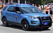 - Ford Police Interceptor Sedan and in both marked and unmarked versions. The marked versions are a dark sky blue. Unmarked cars are a variety of colors.