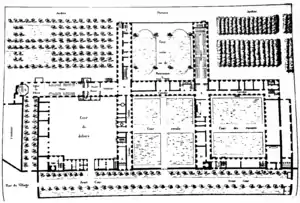 The domaine of Saint-Cyr was assigned to the Maison in 1685, and the king ordered[1] major building work on the domaine next to Versailles, led by Jules Hardouin Mansart.[4] The project cost the king 1,400,000 livres.[4] Hardouin-Mansart's designs for the Maison used the U-shaped plan he often used elsewhere, with the buildings reserved for the mistresses and students forming an H, to which the school chapel had to be added to the west. The classrooms and students' dormitories were on the first and second floors respectively, the dormitories just above the classrooms for the corresponding classes. Each dormitory held 40 beds and was surrounded by two cells for the mistresses. Each classroom was also juxtaposed with a small supplementary dormitory with 20 beds, itself next to two cells for the mistresses. The infirmary was sited away from the dormitories to allow the sick to be isolated and thus avoid the spread of contagious diseases.[1] The rooms reserved for pensionnaires were situated to the east of the buildings, to put them as far as possible from the visitor entrance, situated to the west at the level of the external courtyard.