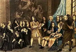 The students at Saint-Cyr first learned theatre in plays written by Madame de Brinon, then in the Conversations written for them by Madame de Maintenon on different moral subjects.[1] They then played in tragedies by Corneille and Racine. However, Madame de Maintenon was unhappy to see the Demoiselles playing scenes of amorous passion with too much ardour, and so Racine wrote the students a religious piece, Esther, which Madame de Maintenon planned to put on before the king and court. This gave rise to a deep dispute between Madame de Maintenon and Madame de Brinon, with the latter opposed to a production that she suspected was only for Madame de Maintenon's own glory. This dispute was not new - since 1687, Madame de Brinon frequently reproached Madame de Maintenon for being around the establishment too much and imposing on Madame de Brinon, its superior.[2] Being its superior for life, Madame de Brinon could not be replaced, but a lettre de cachet sealed on 10 December 1688 allowed the play to be put on. Madame de Loubert, previously secretary to Madame de Maintenon and aged only 22, replaced Madame de Brinon as secretary on 19 May 1689.[5]