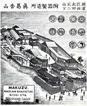 At this time Yokohama still resembled the fishing village it had been, and there was no ceramic or even craft tradition. Suzuki found for Kōzan a site (about 0.3 ha) in Nishiōta (present-day Kanoedai in the central ward of Yokohama). The kiln built there took the name Ōta. The Kantō was also poor in suitable clay, and initially Kōzan had to prospect widely for his materials. Bringing four apprentices from Kyoto, Kōzan by 1872 had overcome the initial problems, and expanded his workshop with a large recruitment of local men and women.[9] This was the period at which modern Satsuma ware was distressed for export as antique, and Pollard considers that, up to 1876 at least, there was truth in the allegation of Frank Brinkley that the Makuzu workshop participated in the fraudulent trade.[10] Johannes Justus Rein visited the business in the mid-1870s.[11]