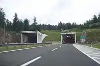 Mala Kapela Tunnel (Croatian: Tunel Mala Kapela) is the most significant structure on the Croatian A1 motorway route. As it is 5,821 metres (19,098 ft) long (northbound tube),[1] Mala Kapela Tunnel is the longest tunnel in Croatia. The tunnel is geographically located between the villages of Jezerane and Modruš (although it cannot be accessed from the villages directly), and between Ogulin and Brinje motorway interchanges. The tunnel passes through the Mala Kapela mountain in the northeast-southwest direction.[2] The first tunnel tube through the Mala Kapela mountain was completed in 2005, and was used for both directions of traffic until the second tube was completed in 2009.[3][4][5][6][7]