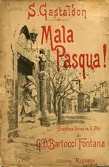 The enormous success of Stanislao Gastaldon's 1881 salon song, "Musica proibita", and his subsequent compositions in that genre had made him famous throughout Italy. In 1887 at the age of 26, he turned his attention to composing his first opera, Fatma, an opera-ballet in four acts. However, he set the project aside in 1888 when the music publisher Sonzogno announced a competition for one-act operas, open to all young Italian composers who had not yet had an opera performed on stage. The three winners (selected by a jury of prominent critics and composers) would be staged in Rome at Sonzogno's expense. Gastaldon decided to enter with an opera based on Cavalleria rusticana. His librettist, Giovanni Domenico Bartocci-Fontana, a lawyer by training and a poet by inclination, wrote to Verga asking permission to adapt the play. Verga wrote back to him on 3 June 1888 to say that he was happy to give his permission but added that the subject as it was treated in the play did not seem suitable for an opera libretto.[lower-alpha 1] Unbeknownst to Verga, another young composer, Pietro Mascagni, entered the same contest at virtually the last minute with his opera Cavalleria rusticana, also based on the story. Gastaldon withdrew his work early in the competition when he received an offer from Sonzogno's rival, Ricordi, to publish it and arrange for its premiere at the Teatro Costanzi in Rome.[2] He expanded his original one-act version to two acts, and then three. Bartocci-Fontana's libretto added some elements that were not in Verga's original and expanded on others as well as changing the name of the Santuzza character to Carmela. However the basic plot and setting remained the same. It was given the title Mala Pasqua! from the curse which Santuzza placed on Turiddu in the original play: "Mala Pasqua a te!" ("May you have an evil Easter!"). The prominent Romanian soprano Elena Theodorini, who had already sung in the premieres of several new operas in Italy, read the score and agreed to sing the key role of Carmela.[3]