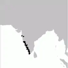 The species is endemic to the Western Ghats mountain range of India from about Nashik in the north to the southernmost hills[7]. The species has an elevational distribution range from about 50 m near the coast (e.g., Phansad Wildlife Sanctuary, Maharashtra) to around 1,500 m in the mountains.[8] In the southern Western Ghats, Malabar Grey Hornbills were reported in evergreen forests between 500 m and 900 m (sporadically to 1,100 m) elevation in Kalakad – Mundanthurai Tiger Reserve, but frequently up to 1,200 m in the Anamalai Hills further north.[9] In both these sites, the estimated Malabar Grey Hornbill density decreased with elevation, with the population density in rainforest fragments in the Anamalai Hills being additionally positively related to food tree species richness. The species is found mainly in dense forest habitats; the thinner dry forest habitat of the plains is typically occupied by the Indian grey hornbill. The Sri Lanka grey hornbill was included with this species in the past, but is now considered distinct.[4]