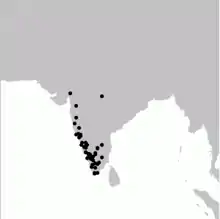 Malabar whistling thrushes are usually found in dark undergrowth in dense riverine forest.[5] They typically forage in the margins, beds and adjacent ground of rocky hill streams and rivers in forest, secondary growth and plantations from foothills upto 2200 m above sea level but reaches the plains in the rains.[4] The species is found all along the Western Ghats south of the Surat Dangs. They are also found along the Satpura range to Chhattisgarh[8] and northwestern Orissa (Surguja and Simlipal National Park).[9][10] Also locally in the Eastern Ghats.[11] Populations are not migratory but are known to disperse widely in winter.[12] An individual that was ringed in Mahabaleshwar in the summer of 1972 was recovered in the winter of 1976 in Sampaje, Coorg.[13] Although historically recorded twice from Mount Abu,[14][15] more recent surveys have not recorded the bird or suitable habitat.[16]