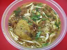 Bruneian Malay cuisine is often spicy and commonly eaten with either rice or noodles. Beef rendang, nasi lemak and pajeri nanas are popular foods in Brunei.[14] Among the few dishes peculiar to Brunei is ambuyat, a sticky ball of flavourless sago starch, which is wrapped around a bamboo fork and dipped into a spicy and sour gravy.
