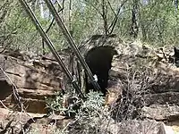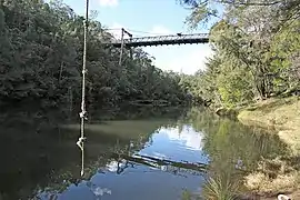 Maldon was also the site of 'Harvey's Crossing', one of two stone causeways over the Upper Nepean River on the Picton - Menangle Road. Stonework supporting the steep approach roads on each side can still be seen. The causeway was replaced by a wooden suspension bridge in 1903, designed by Ernest Macartney de Burgh.[3] By the 1970s, the bridge had become a severe bottleneck, especially with the increasing coal traffic. A deviation of the main road and a concrete beam bridge were constructed further north along the Gorge, and opened in 1980.[4] The Suspension Bridge is now a Heritage item.[5] It is closed to all traffic, including pedestrian.