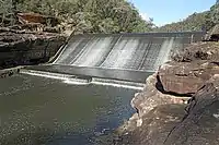 The Maldon Weir (34°12′12.27″S 150°37′47.01″E) lies about 250 metres upstream from the Suspension Bridge. It formerly supplied water to the nearby Stonequarry Lodge Hostel.[7] Maldon Weir is currently (August 2010) the only weir on the Upper Nepean River not targeted for modification, despite having been identified as a major barrier to fish migration.[8] Most other Upper Nepean weirs will be given increased capacity, to improve environmental flows, and improved fishways will be installed, as part of Sydney Catchment Authority's Weirs Project.[9]