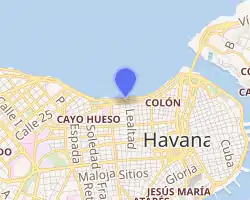 The Malecón (officially Avenida de Maceo) is a broad esplanade, roadway, and seawall that stretches for 8 km (5 miles) along the coast in Havana, Cuba,[1] from the mouth of Havana Harbor in Old Havana, along the north side of the Centro Habana neighborhood and the Vedado neighborhood, ending at the mouth of the Almendares River. New businesses are appearing on the esplanade due to economic reforms in Cuba that now allow Cubans to own private businesses.[2]