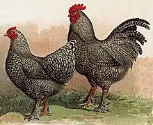 The Malines, Dutch: 'Mechelse Koekoek', is a Belgian breed of large domestic chicken. It originates from the area of Mechelen (French: Malines), in the province of Antwerp in Flanders, for which it is named. It was created in the nineteenth century by cross-breeding local cuckoo-patterned farm chickens with various different types of imported Oriental chicken. With the Jersey Giant, it is among the heaviest of all chicken breeds. It is valued for the quality of its meat, which is pale in colour and fine-textured.[4][5]
