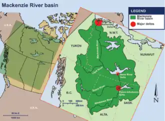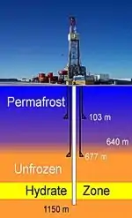 The Mallik Gas Hydrate Production Research Well, part of the "Methane Hydrate Research and Development (R&D) Program,"[4] is located on the northwest side of Richards Islands and is a part of the Mackenzie Delta, entering the Beaufort Sea. The production research well project was developed in the Mallik region after methane hydrate was recovered there by a research project in 1998, led by the Geological Survey of Canada and the former Japan Oil, Gas and Metals National Corporation (JNOC), with participation by the United States Geological Survey (USGS), the United States Department of Energy (DOE) as well as other industry partners.[5] The project included working efforts of more than 200 scientists and engineers worldwide. Up to today numerous papers have been published to document the results and additional datasets, and provide information on in-situ physical and geophysical properties of gas hydrates, gas hydrate production testing, and the relevance of gas hydrates to energy, climate and geohazard research. Its main outcome was the characterization of gas hydrates found in the Northwest Territories and planning of additional field and laboratory studies. The aim was to determine the future potential for methane as an important factor of the future world energy consumption, additional energy policy and to assess the production and properties of the gas hydrate and its stability. The program was further developed to find out if the increased use of burning methane could contribute to reductions in greenhouse gas emissions on a global scale, impacting future climate change if released into the environment. Furthermore, the scientific study aimed to develop new safety techniques guarding against any hazardous conditions created by gas hydrate drilling and pipeline construction and give insights into drilling and production technology with regard to a new industrial development.