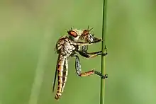 Adult M. bomboides prey on bumblebees, their mimetic models, to a great extent.[7] Though their attacks are swift, it is possible that the resemblance of the fly to the prey and mode enhances the likelihood of its success.[7] The same argument for aggressive mimicry in Volucella flies could apply in M. bomboides.[7] Consistent with other members of the family Asilidae, larvae are thought to be predaceous, feeding on soft-bodied insects in the soil.[7] In terms of aggressive mimicry, the female flies of M. bomboides may enter into bumblebee nests to lay eggs.[7] Due to their mimetic resemblance, M. bomboides females could then escape recognition and attack.[7] Once hatched, the fly larvae could consume bumblebee larvae as a food source.[7] However, all this is merely speculative and further experimentation will help elucidate the validity of this model.[7]