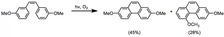 Under UV irradiation, stilbene and its derivatives undergo intramolecular cyclization to form dihydrophenanthrenes. In the presence of an oxidant, the dihydrophenanthrenes aromatize to give polycyclic aromatics. Typically, the dihydrophenanthrenes themselves are relatively unstable, and revert to cis-stilbenes in the absence of a hydrogen-trapping agent. Suitably substituted stilbenes may undergo irreversible, rearomatizing elimination or [1,n]-shift processes in the absence of an oxidant. Aryl enynes,[4] heteroatomic stilbene derivatives (e.g. amides[5]), and substrates containing a single heteroatom in place of the stilbene double bond[6] also undergo the reaction.