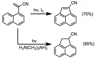 Photocyclization can also form five-membered rings. In the vinyl naphthalene series, both oxidative[10] and non-oxidative processes are possible; although the latter requires a proton-transfer catalyst.[15]