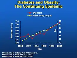 Excessive consumption of energy-dense foods and drinks and limited physical activity causes overnutrition.[54] It causes overweight, defined as a body mass index (BMI) of 25 or more, and can lead to obesity (a BMI of 30 or more).[25][2] Obesity has become a major health issue worldwide.[55] Overnutrition is linked to chronic non-communicable diseases like diabetes, certain cancers, and cardiovascular diseases. Hence identifying and addressing the immediate risk factors has become a major health priority. [56] The recent evidence on the impact of diet-induced obesity in fathers and mothers around the time of conception is identified to negatively program the health outcomes of multiple generations. [57]