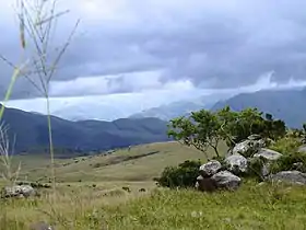 Malolotja National Park covers 18,000 hectares (44,000 acres) of mountain wilderness on Eswatini's northwestern border with South Africa. The park includes Ngwenya Mountain, Eswatini's second highest mountain (1,829 m),[1] and Malolotja Falls which drop 89 metres (292 ft), the highest in Eswatini.[2] Habitats include short grassland to thick riverine scrub, bushveld and Afromontane forest.[1]