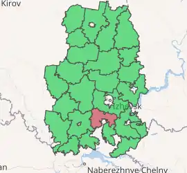 Malopurginsky District (Russian: Малопурги́нский райо́н; Udmurt: Пичи Пурга ёрос) is an administrative[1] and municipal[7] district (raion), and one of the twenty-five in the Udmurt Republic, Russia. It is located in the south of the republic. The area of the district is 1,223.2 square kilometers (472.3 sq mi).[3] Its administrative center is the rural locality (a selo) of Malaya Purga.[2] Population: 33,058 (2010 Census);[4] 31,558 (2002 Census);[9] 30,849 (1989 Census).[10] The population of Malaya Purga accounts for 23.3% of the district's total population.[4]