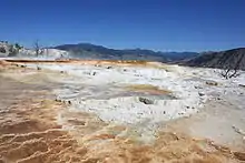 Mammoth Hot Springs is a large complex of hot springs on a hill of travertine in Yellowstone National Park adjacent to Fort Yellowstone and the Mammoth Hot Springs Historic District.[3] It was created over thousands of years as hot water from the spring cooled and deposited calcium carbonate (over two tons flow into Mammoth each day in a solution). Because of the huge amount of geothermal vents, travertine flourishes.[4] Although these springs lie outside the caldera boundary, their energy has been attributed to the same magmatic system that fuels other Yellowstone geothermal areas.