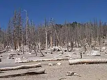 Mammoth is outgassing large amounts of carbon dioxide out of its south flank, near Horseshoe Lake, causing mazuku in that area. The concentration of carbon dioxide in the ground ranges from 20 to 90 percent CO2. Measurements of the total discharge of carbon dioxide gas at the Horseshoe Lake tree-kill area range from 50 to 150 short tons (45 to 140 t) per day. This high concentration causes trees to die in six regions that total about 170 acres (0.69 km2) in size (see photo).[15]
